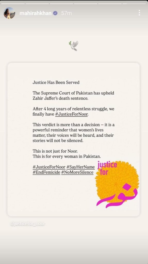 The entertainment industry has been vocal throughout this case, with many Pakistani celebrities advocating for justice and sharing their anguish over Noor’s story. Following the Supreme Court’s ruling, stars from across the industry took to social media to express their relief and solidarity.