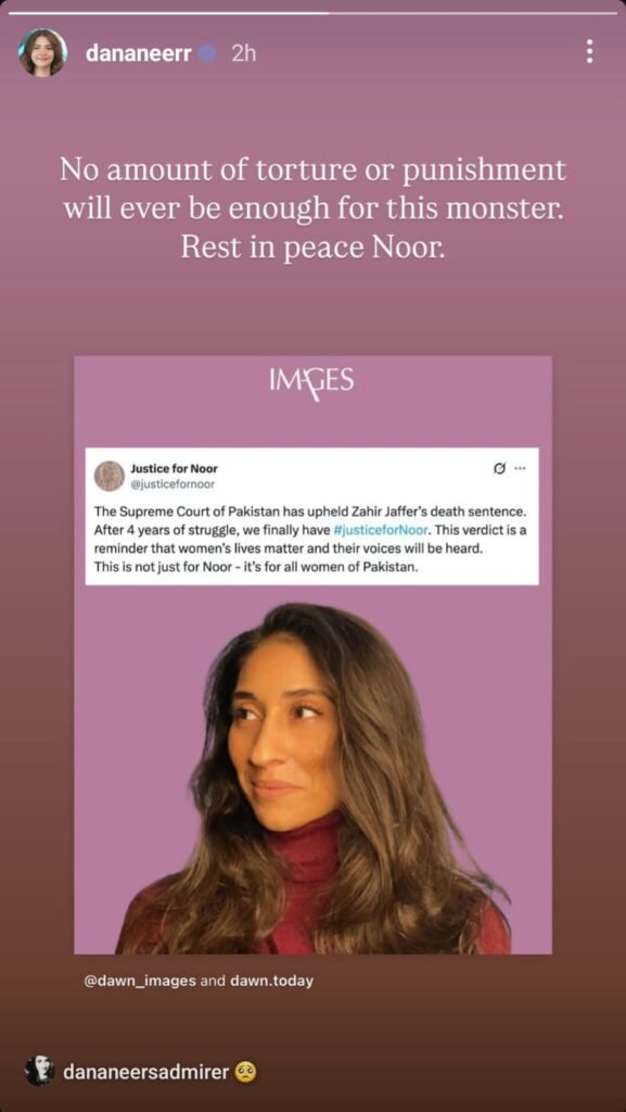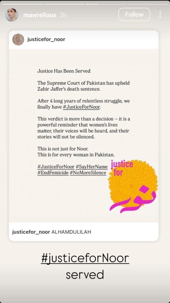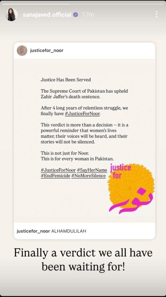Meanwhile, actresses like Minal Khan, Aiman Khan, Komal Meer, Kinza Hashmi, Hania Aamir, Hajra Yamin, and Mariam Nafees reshared the iconic “Justice for Noor” banner on their Instagram stories, amplifying the verdict’s significance.