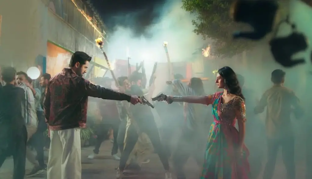 The first look of Sher is an electrifying action sequence. Danish Taimoor enters with his signature smolder—furious, brooding, and ready for war—brandishing a gun like he owns the world. Enter Sarah Khan in a striking ghagra choli, equally fierce, matching Danish’s intensity beat for beat, pointing her gun right back at him.