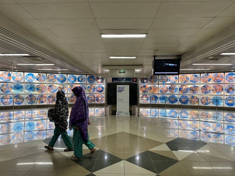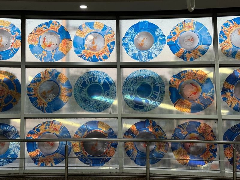 At the Shalimar Train Station, visitors are treated to an awe-inspiring 85-foot-wide translucent mural that adorns a curtained wall. This intricate piece features circular window-like paintings of water tanks, allowing natural light to filter through and creating a dynamic visual experience that changes throughout the day. The interplay of light and color transforms the space, reflecting the passage of time and the cyclical nature of water consumption.