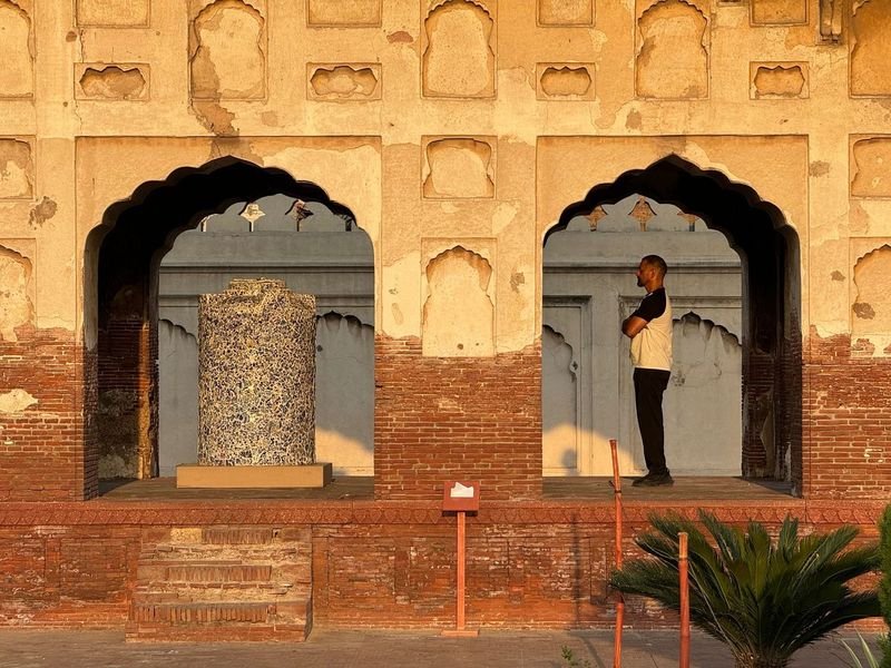 In the historic Shalimar Gardens, Qureshi has created a life-sized water tank from discarded Multani crockery fragments, intricately adorned with floral motifs inspired by traditional decorative vases. This stunning piece merges art and nature, contrasting beautifully with the adjacent landscape of rooftops filled with blue tanks. It evokes a sense of beauty in an otherwise utilitarian object, encouraging visitors to reconsider the value of what they see in their daily lives.