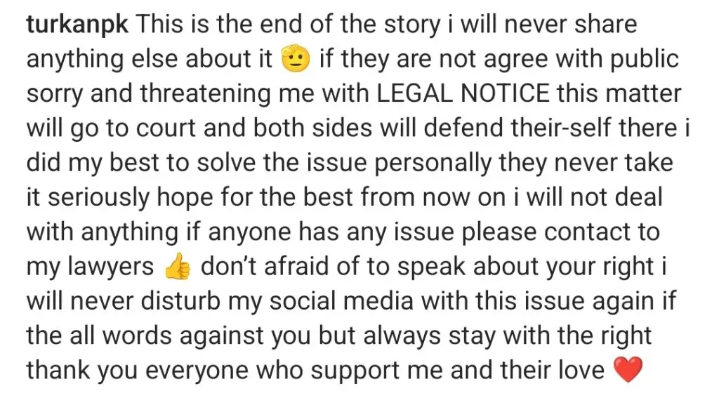 Türkan expressed her disappointment, revealing that she tried her best to resolve the matter personally and peacefully, but felt that her efforts were not taken seriously. She concluded her statement by urging her followers to always stand up for their rights and thanked everyone who supported her throughout the ordeal. She also mentioned that she will no longer engage in any public discussions about the situation and will let the legal process take its course.