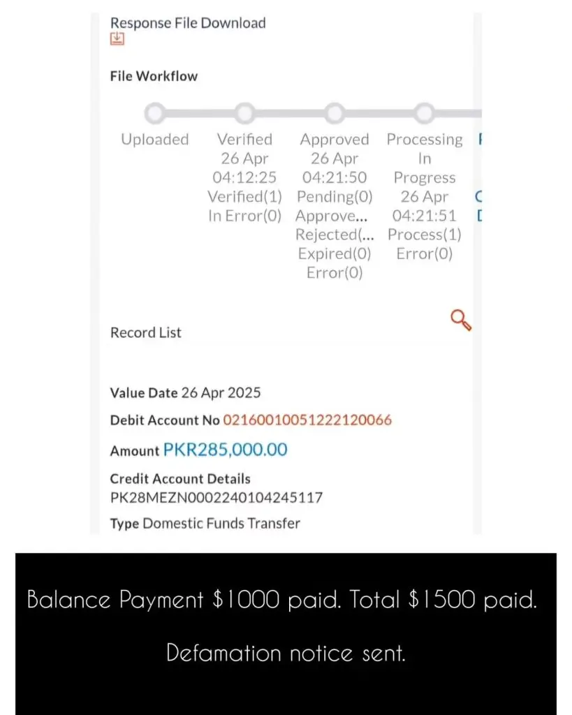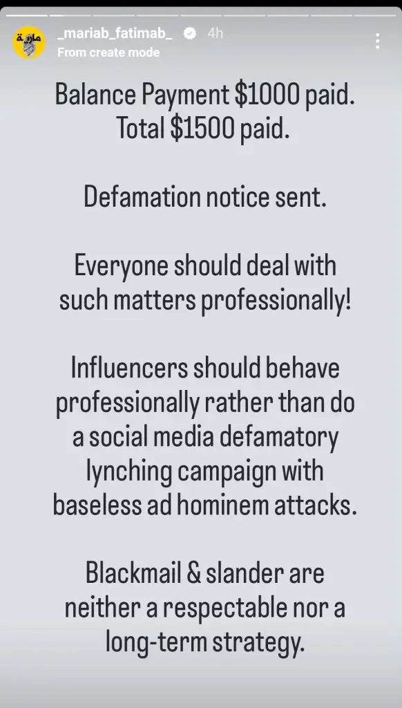 To address the issue, Maria B posted an official update on her Instagram account. In her post, she informed her followers that the outstanding payment of $1,500 USD (approximately 420,000 PKR) had been successfully transferred to Türkan Atay through an online banking transaction.