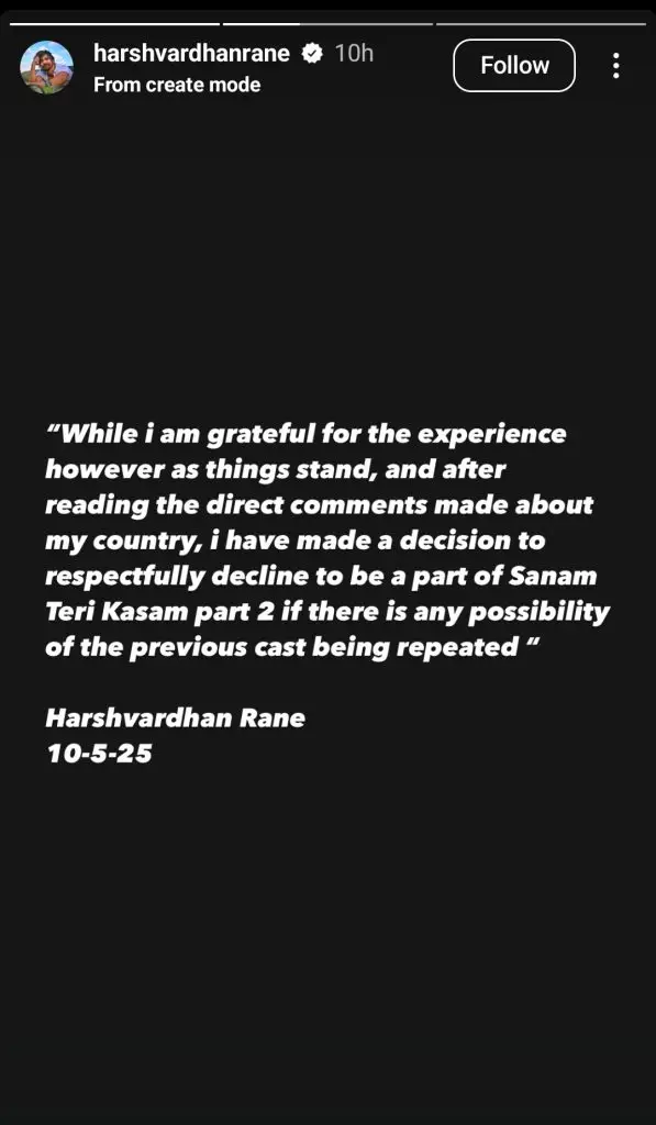The tension began in the aftermath of heightened political conflict between India and Pakistan. Harshvardhan Rane, who starred opposite Mawra in Sanam Teri Qasam, reacted negatively to Mawra’s patriotic social media posts. In an unexpected and public statement, Rane expressed strong disapproval of Mawra’s stance and declared that he would not participate in a sequel to the film if it included the original cast. His exact words were: