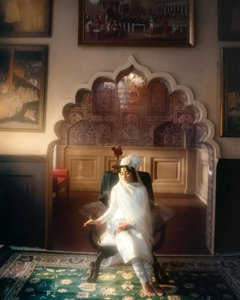 The aesthetic of the shoot, from the deep, warm tones to the delicate, traditional accessories, evokes a sense of nostalgia, making it feel like a portrait straight out of a historical era.